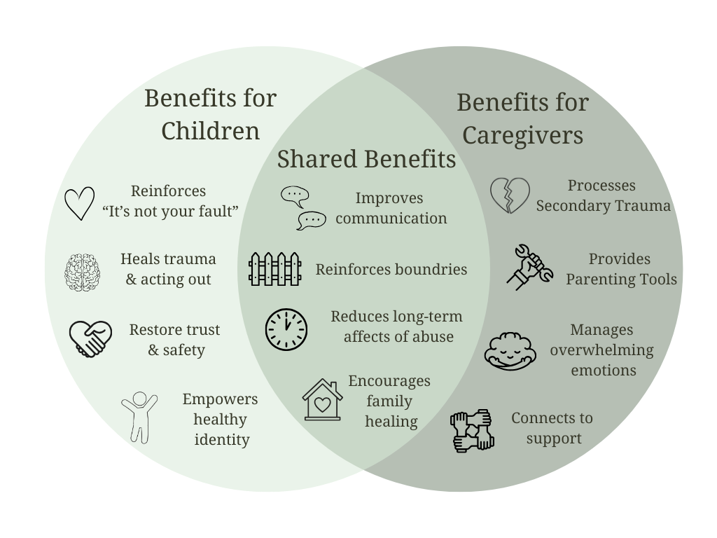 Los cuidadores reciben apoyo para comprender el proceso de tratamiento, gestionar sus propias respuestas emocionales y aprender a hablar con sus hijos sobre lo sucedido de una manera adecuada a su edad y que les brinde apoyo. La terapia también tranquiliza a los cuidadores asegurándoles que el abuso no fue culpa suya y les ofrece orientación cuando los sistemas de apoyo tradicionales pueden no estar disponibles o resultar complicados.
