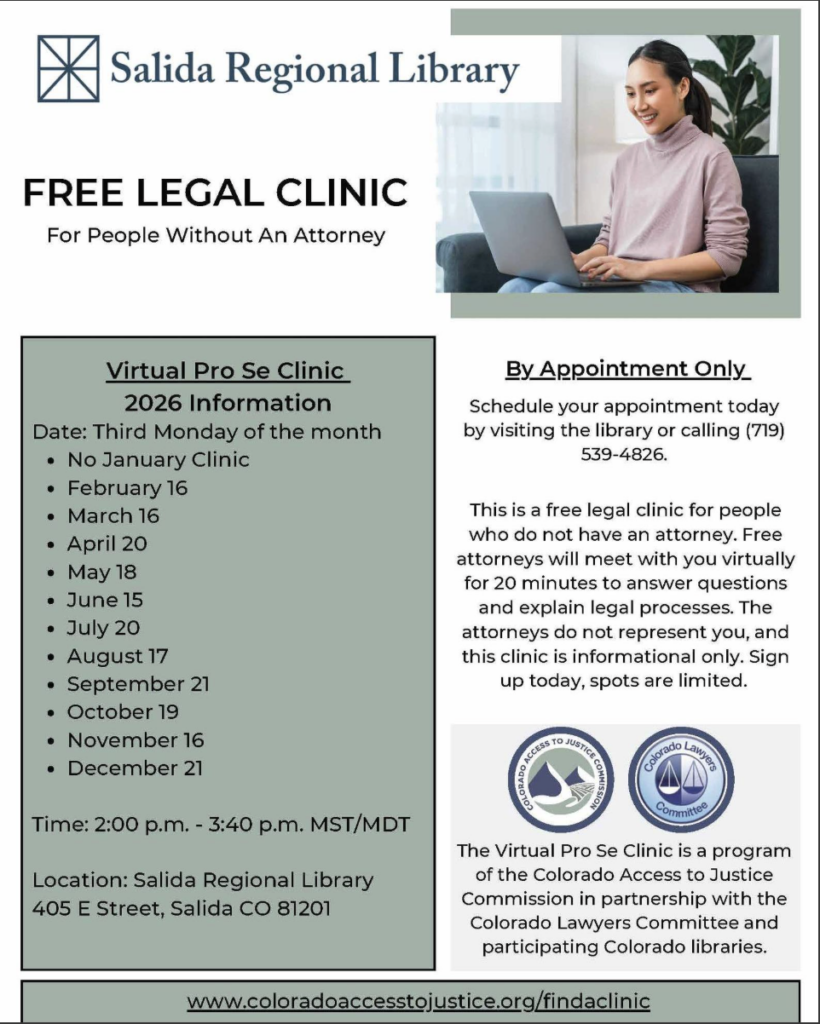 Free 20-minute virtual appointments with a volunteer attorney for individuals without legal representation. Held monthly at the Salida Regional Library.