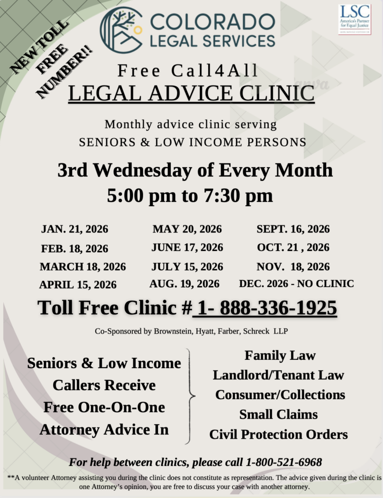 Free monthly call-in legal advice clinic for seniors and low-income individuals. Speak one-on-one with a volunteer attorney by phone.